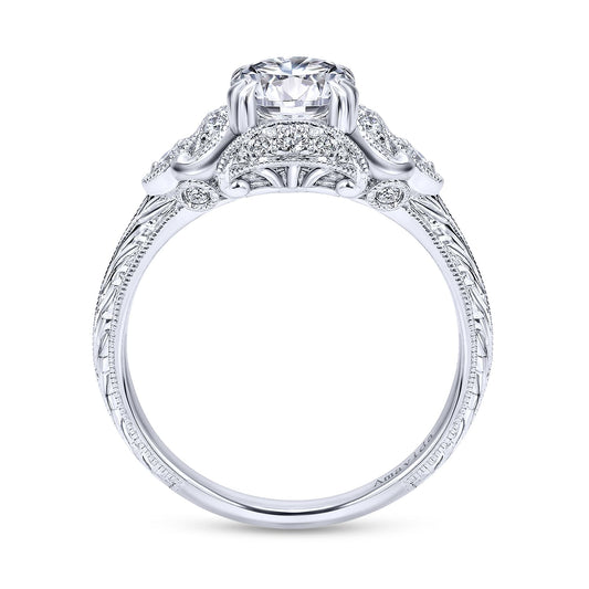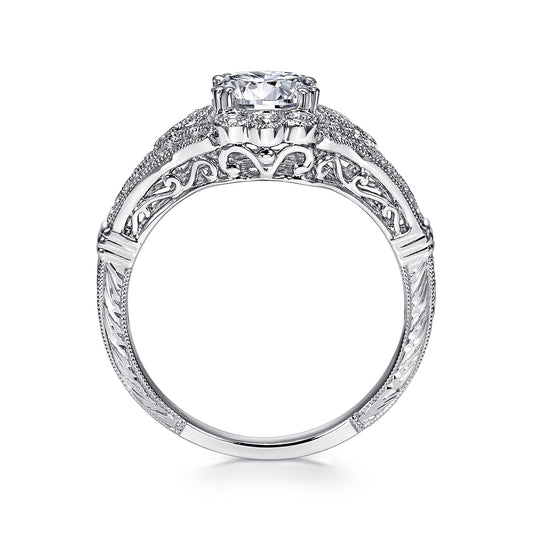 Unique 14K White Gold Vintage Inspired Diamond Halo Engagement Ring