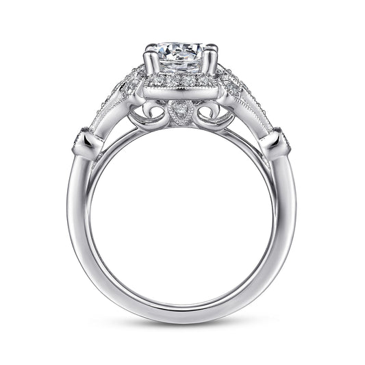 Unique 14K White Gold Vintage Inspired Halo Diamond Engagement Ring
