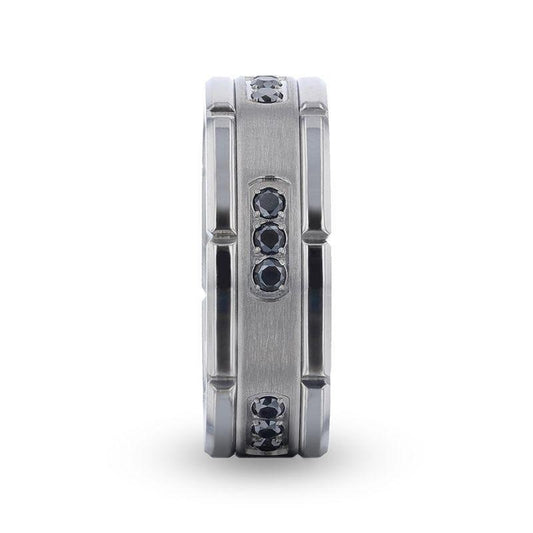 COURAGEOUS Brushed Center Titanium Men's Wedding Band With Double Grooved Polished Edges And Black Diamond Settings - 8mm