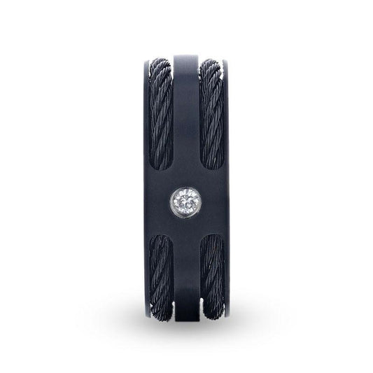 NOIR Double Black Rope Inlaid Brushed Matte Black Titanium Men's Wedding Band With Black Edge Channel Setting And White Diamond In The Center - 8mm