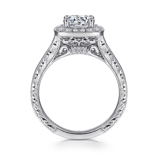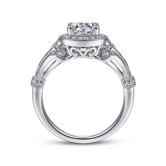 Vintage Inspired 14K White Gold Cushion Halo Round Diamond Engagement Ring