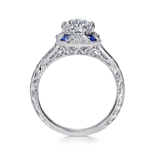 Vintage Inspired 14K White Gold Octagonal Halo Round Sapphire and Diamond Engagement Ring