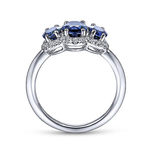 Gabriel & Co. LR52023W45SA 14K White Gold Diamond and Sapphire Oval Halo Three Stone Ring