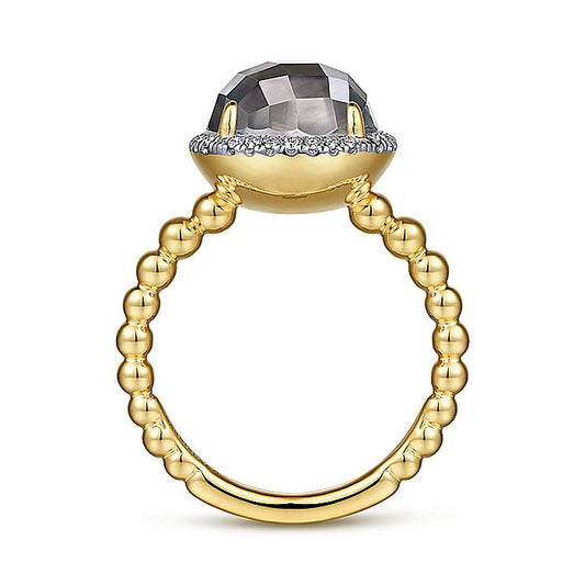 Gabriel & Co. LR51772Y45XB 14K Yellow Gold Round Rock Crystal/Black Pearl and Diamond Halo Ring