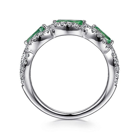 Gabriel & Co. LR50257W45EA 14K White Gold Twisted Diamond Rows and Emerald Marquise Stones Ring