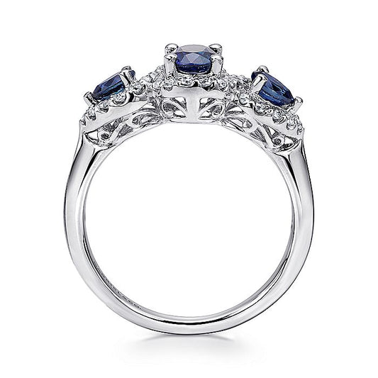 Gabriel & Co. LR50333W45SA 14k White Gold 3 Stone Sapphire and Pavé Diamond Halo Ring