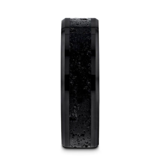 VESUVIUS Men's Polished Black Ceramic Wedding Band with Black & Gray Lava Rock Stone Inlay & Polished Beveled Edges - 6mm & 8mm