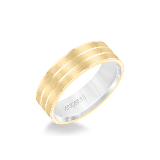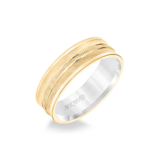6.5MM Men's Wedding Band - Yellow Gold Coin Finish with Flat Cuts with White Gold Interior and Flat Edge