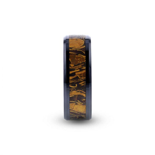 Vendor:ThorstenAuthorized DealerSAHARA Men's Black Ceramic Wedding Band with Sanskrit Stone Inlay & Polished Beveled Edges - 8mm