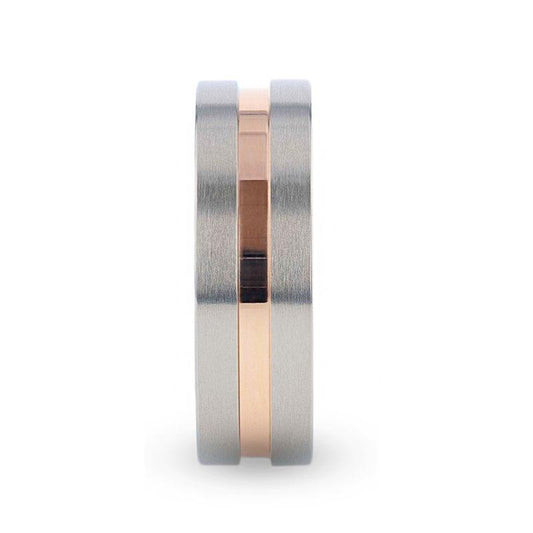 MARS Titanium Flat Brushed Finished Men's Wedding Ring With Rose Gold Plated Groove Center - 8mm