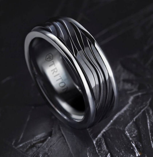 8MM Black Tungsten Carbide Ring - Wave Black Titanium Insert with Round Edge