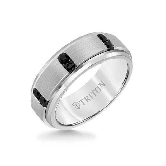 8MM Tungsten Black Sapphire Ring - Vertical Channel Set Silver Satin Finish and Bevel Edge