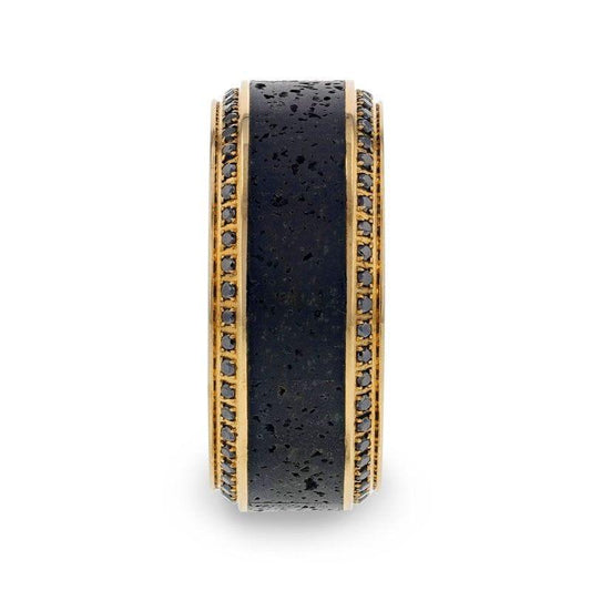 HYPERION Lava Inlaid 10K Yellow Gold Wedding Ring Polished Beveled Edges Set with Round Black Diamonds - 10mm