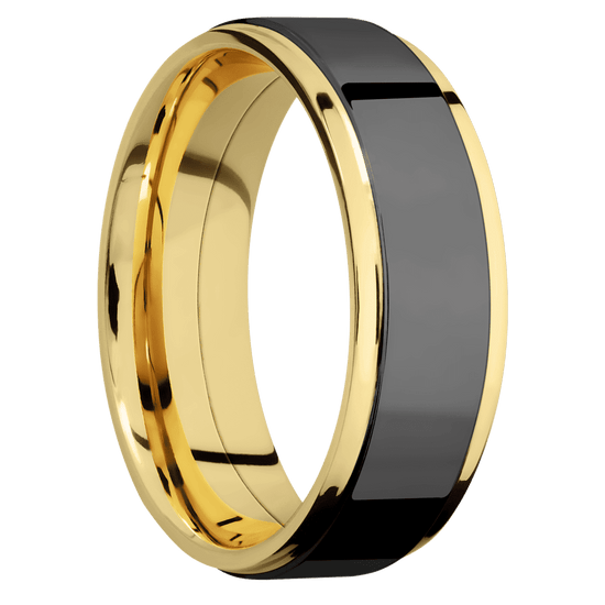 7 mm wide/Flat Grooved Edges/14K Yellow Gold band with one 5 mm Raised Centered inlay of Zirconium.