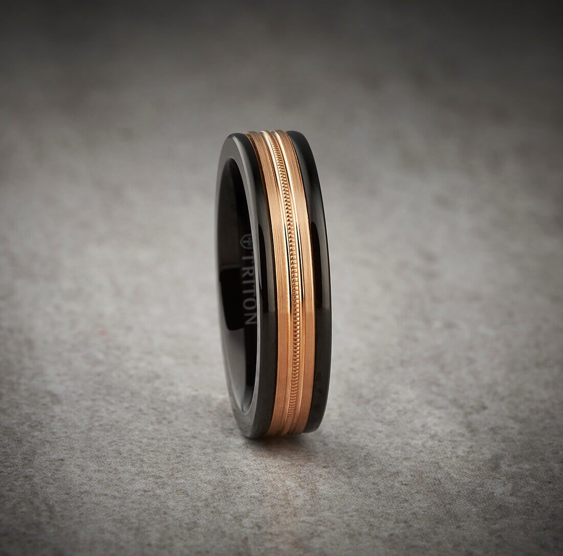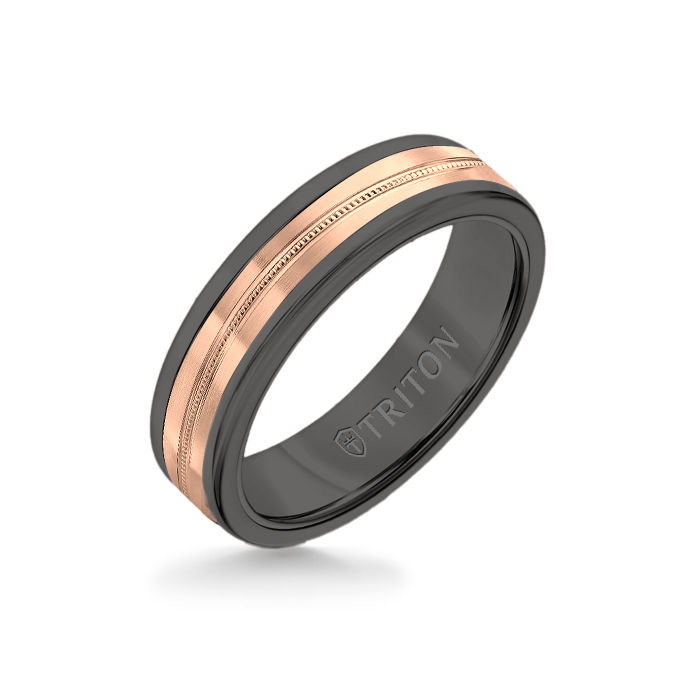 6MM Black Tungsten Carbide Ring - Center Milgrain 14K Rose Gold Insert with Round Edge