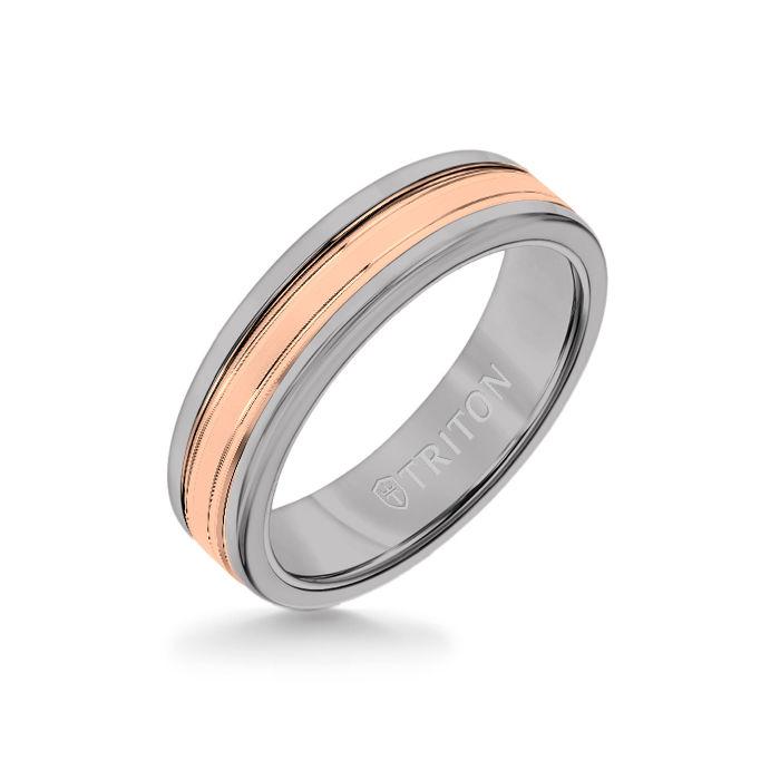 6MM Grey Tungsten Carbide Ring - Double Engraved 14K Rose Gold Insert with Round Edge