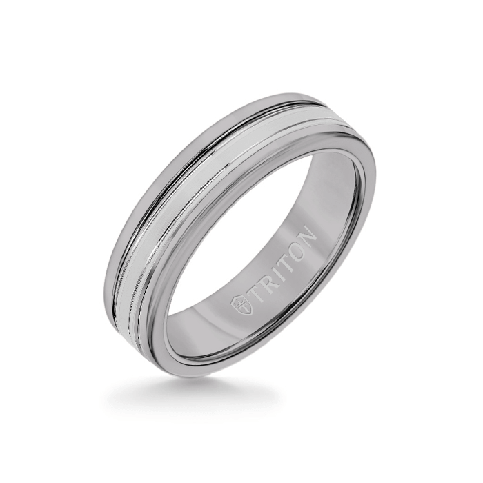 6MM Grey Tungsten Carbide Ring - Double Engraved 14K White Gold Insert with Round Edge