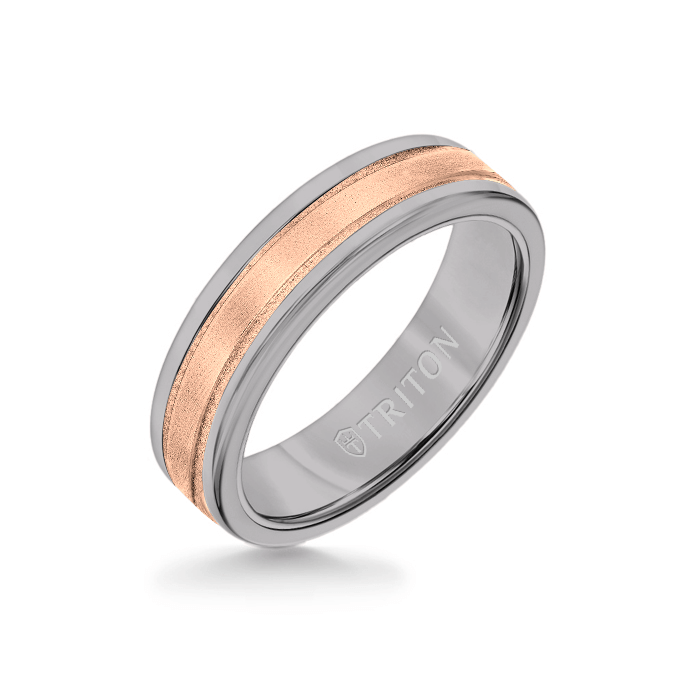 6MM Grey Tungsten Carbide Ring - Step Edge 14K Rose Gold Insert with Round Edge
