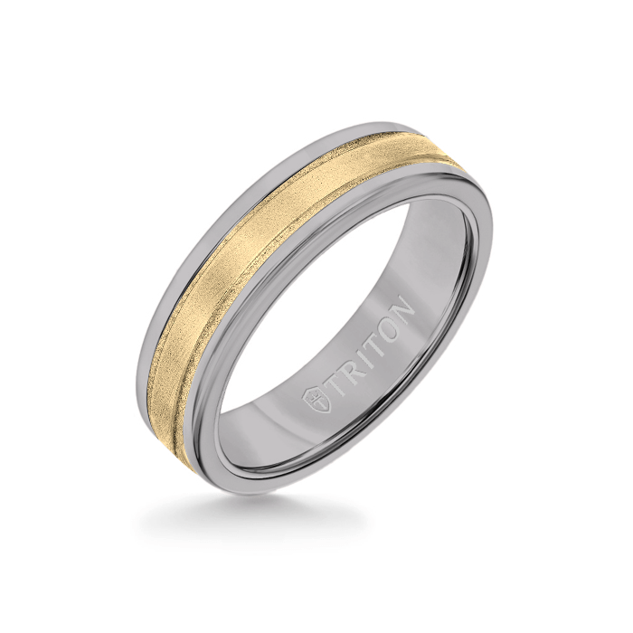 6MM Grey Tungsten Carbide Ring - Step Edge 14K Yellow Gold Insert with Round Edge