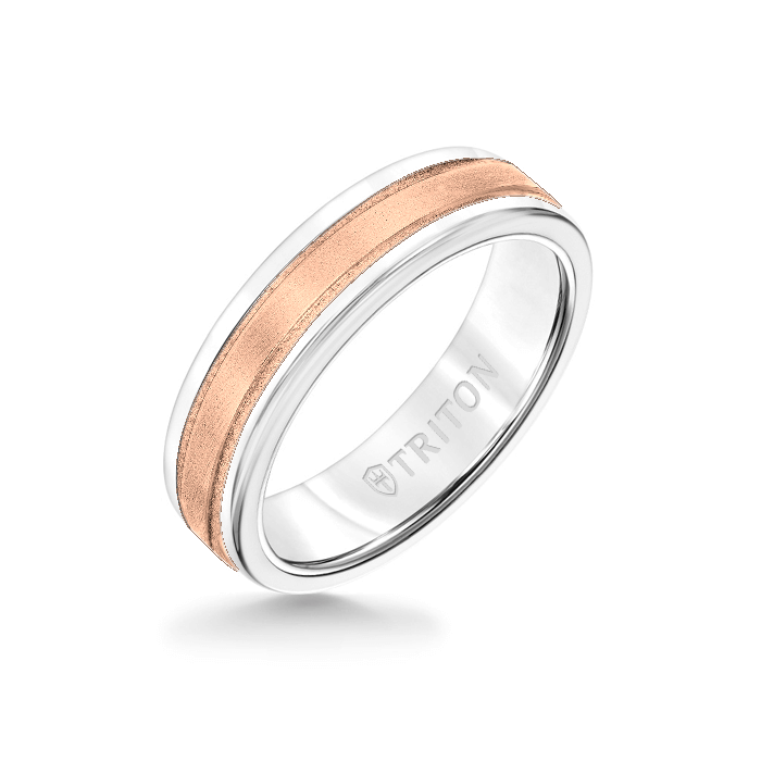6MM White Tungsten Carbide Ring - Step Edge 14K Rose Gold Insert with Round Edge