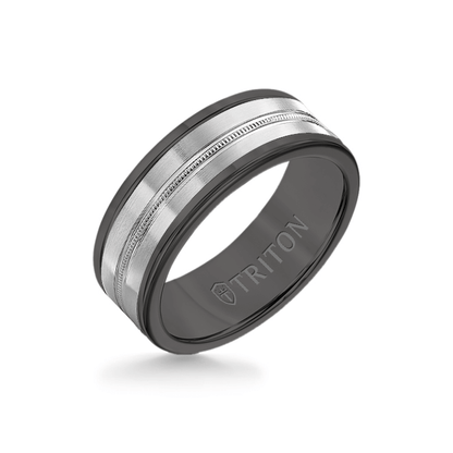 8MM Black Tungsten Carbide Ring - Center Milgrain 14K White Gold Insert with Round Edge