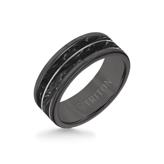 8MM Black Tungsten Carbide Ring - Forged Carbon and Titanium Center Line Insert with Round Edge