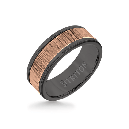 8MM Black Tungsten Carbide Ring – Vertical Geometric 14K Rose Gold Insert with Round Edge
