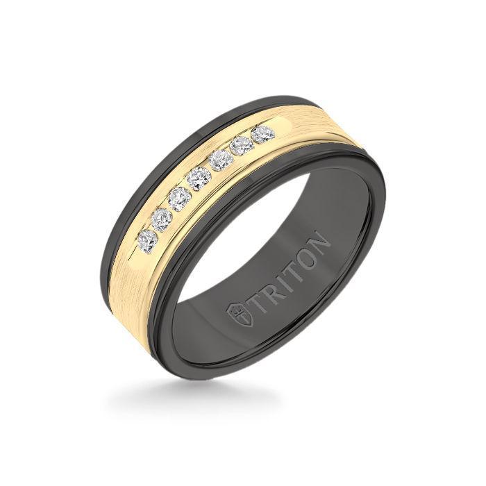 8MM Black Tungsten Carbide Ring - White Diamonds 14K Yellow Gold Insert with Round Edge