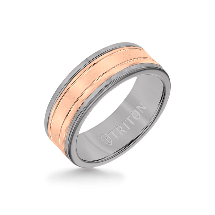 8MM Grey Tungsten Carbide Ring - Double Engraved 14K Rose Gold Insert with Round Edge