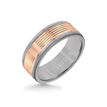 8MM Grey Tungsten Carbide Ring - Serrated Engraved 14K Rose Insert with Round Edge