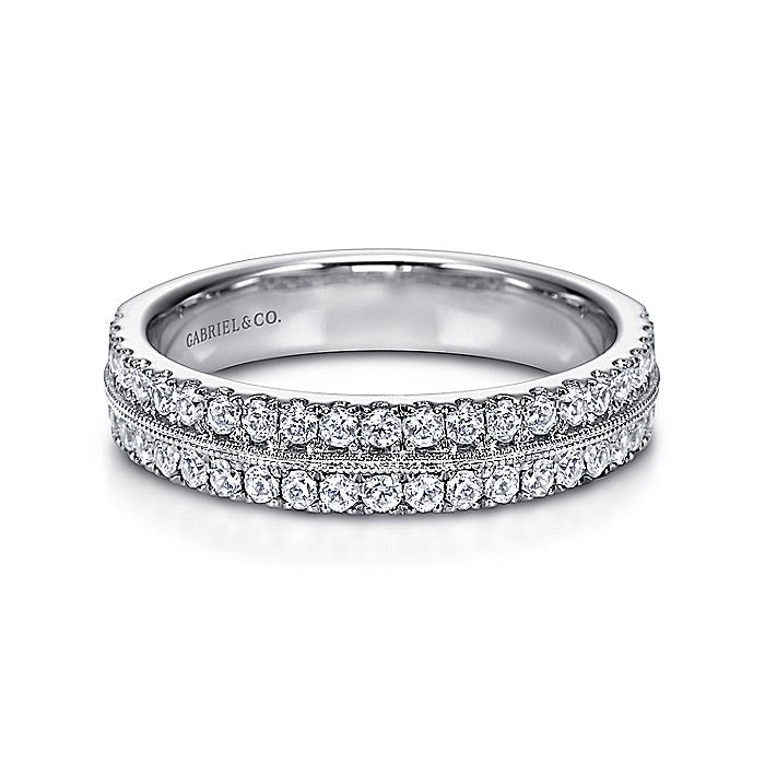 A double row anniversary band featuring dual rows of sparkling diamonds divided by an elegant milgrain border.
