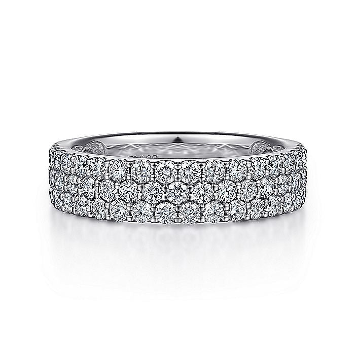 This chic variation on the classic anniversary band features three layers of glittering diamonds in shared prong settings.