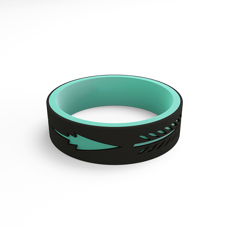 Looking for a ring that is as unique as you are? Look no further than Arrow's Black and Aqua Arrow Silicone Band! With two layers of contrasting silicone and an arrow pattern all throughout, this silicone ring is sure to suit any need! Designed for a more comfortable wear, this ring features two different colors of comfort fit silicone layered atop one another. Battling against the daily grind? Slip this durable ring around your finger to stay stylishly prepped for anything life throws at you.