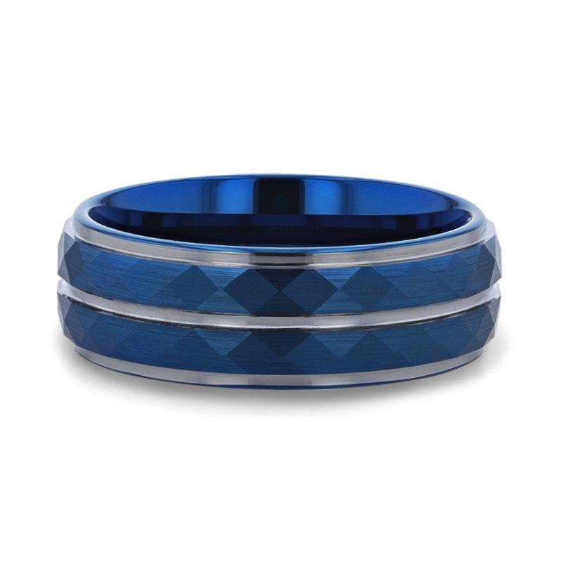 A real tour de blue. The CARMEL is a brilliant blue Tungsten band with Blue Ion plating. In the center, and on each edge, are silver, stepped inlays. The entire front has a faceted finish offering a unique texture and feel. It comes in an 8mm width and several sizes.