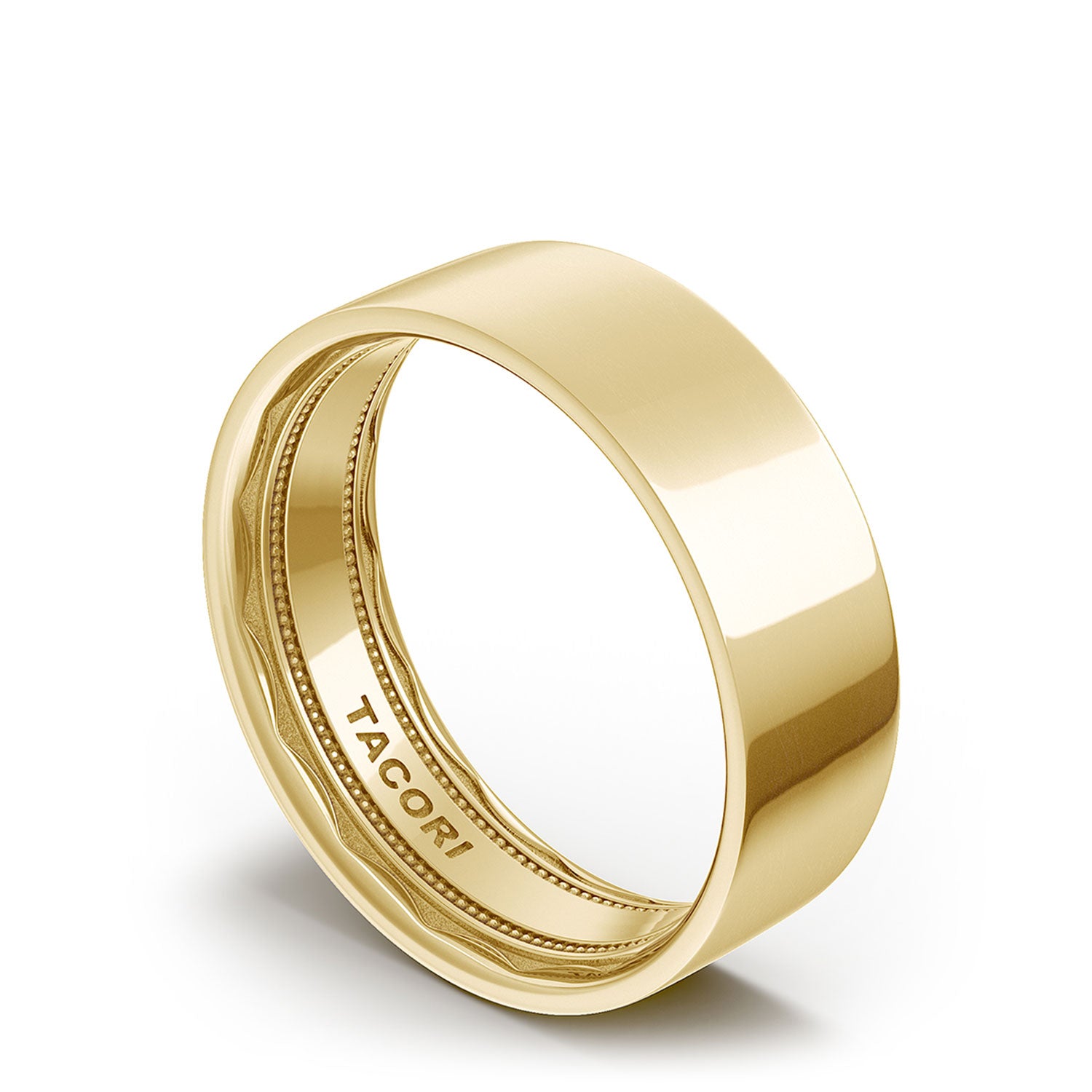 This wedding band is a true classic, with an angular, flat-facing high polish exterior that gives off a sleek and eye-catching gleam. The interior boasts sculpted crescent detail with a soft-comfort fit for all-day wearability.