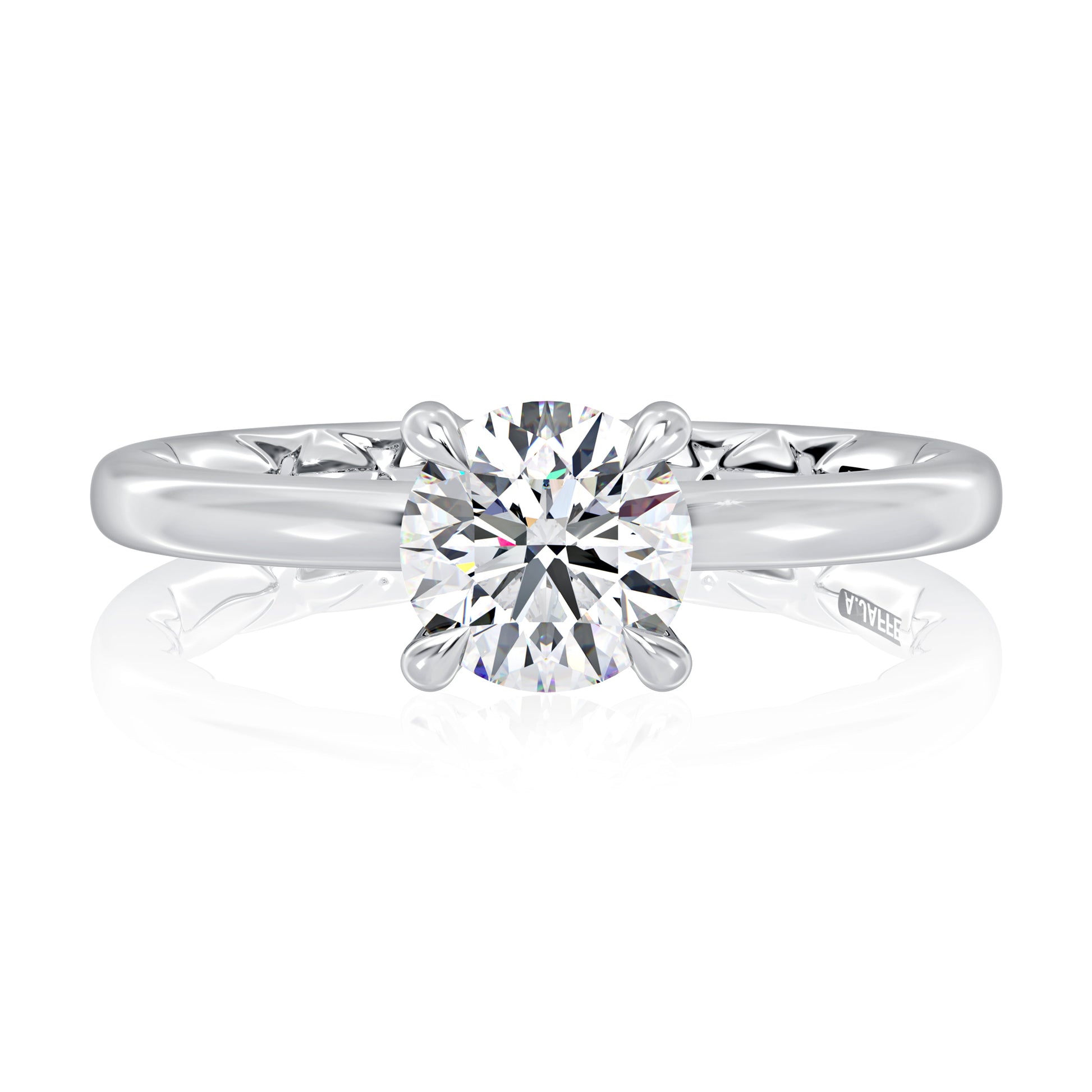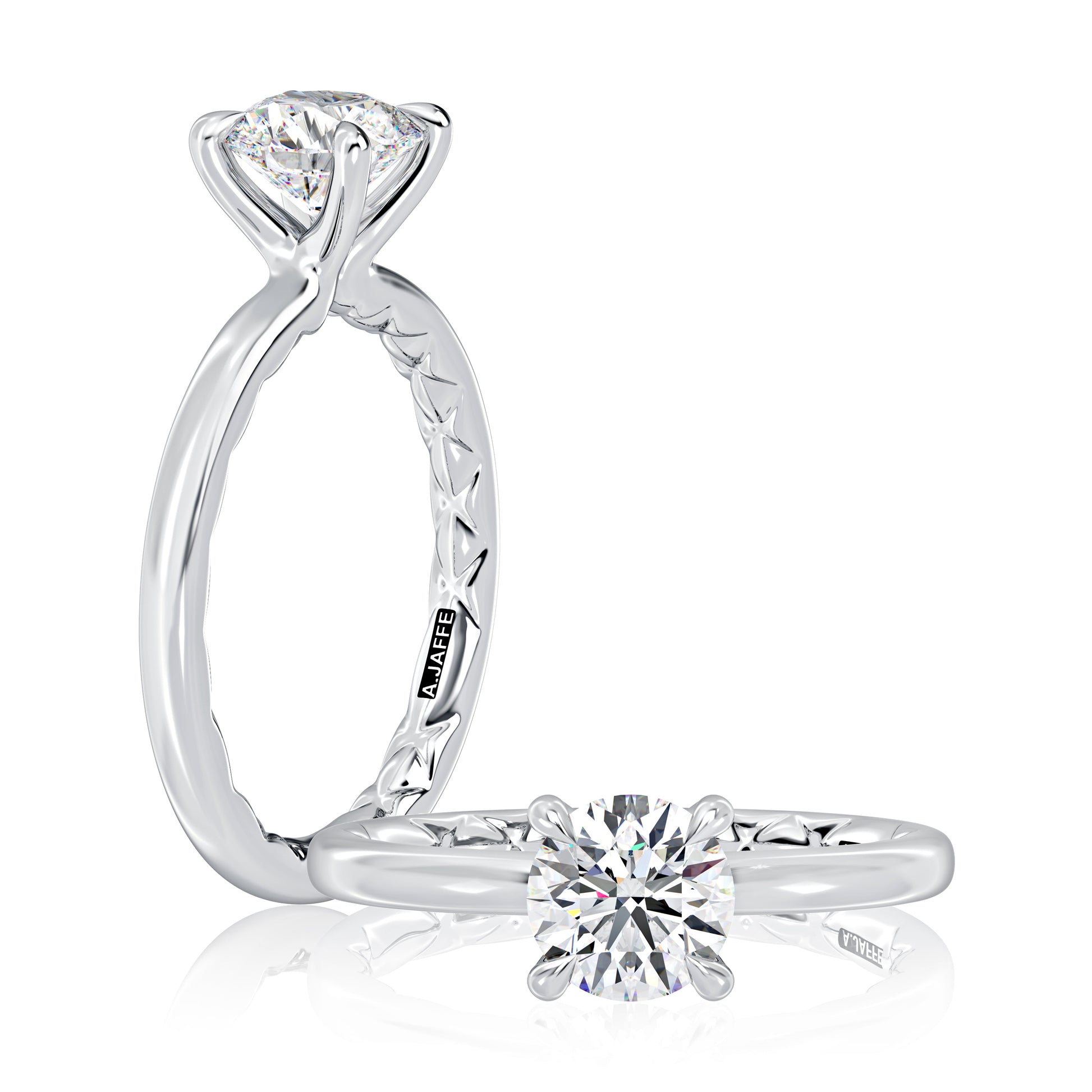 This stunning four prongs diamond engagement ring features a Classic Round Center Stone. The ring highlights a solitaire setting to give all of the attention to the center stone. Lastly, the band features a quilts interior that prevents the ring from spinning.