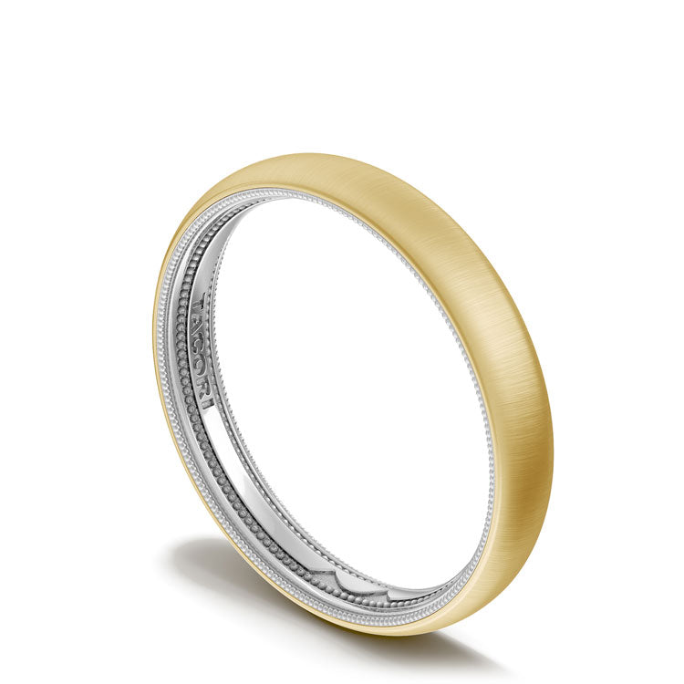 A band of two TACORI metals, 18kt Yellow Gold and 18kt White Gold, features a stunning tone-on-tone color contrast. The inner face silhouette is decorated with Crescent detailing and hand-hewn milgrain. Rings are available in sizes 4-12.