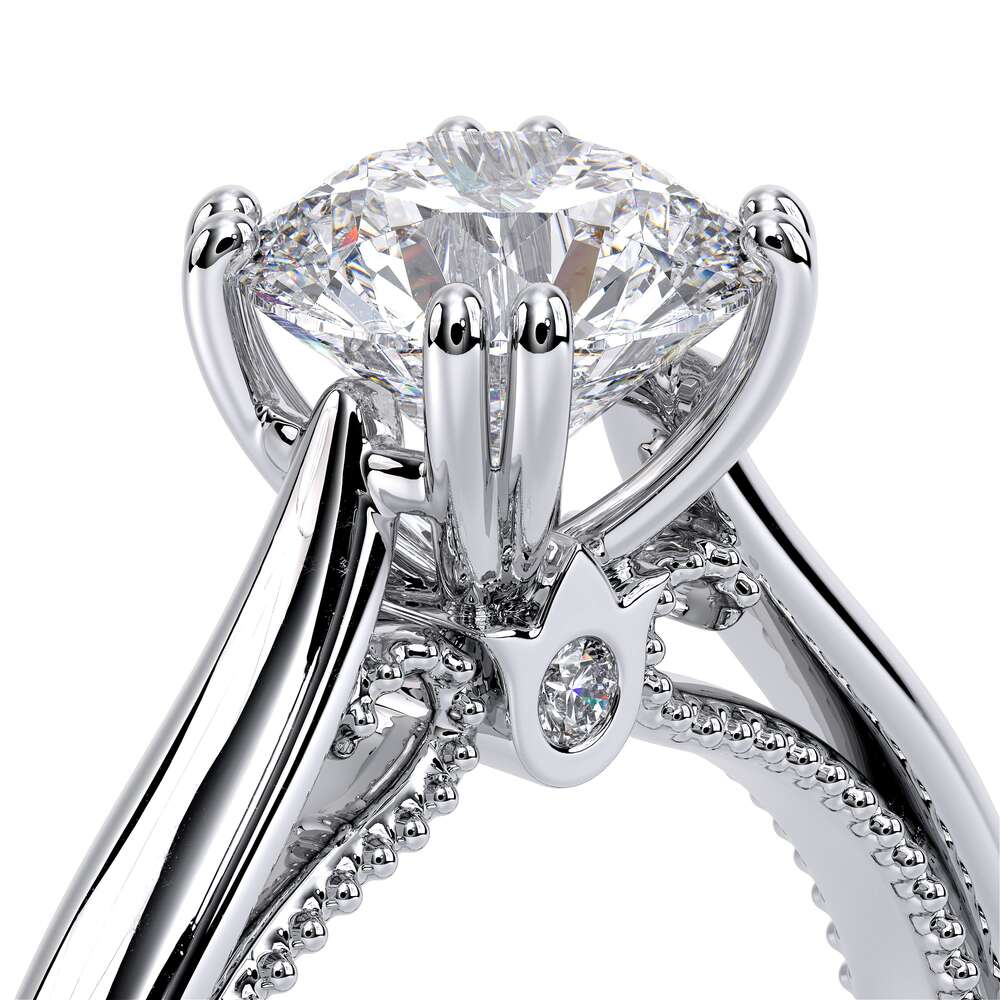 COUTURE-0418R Round Classic Solitaire Engagement ring with simple Double Claw Prongs, featuring the Verragio Crest and upward Scrollwork Signature Beading profile, completed with the Couture pointed shank.