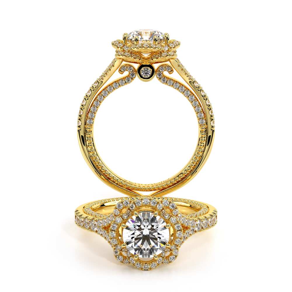 COUTURE-0444R One of a Kind Double Floret Engagement ring that features a pave set cathedral diamond band, the subtle sparkle of our half diamond Riviera, adorned with the Verragio Crest and our Verragio Signature Beading, completed with the Couture shank.