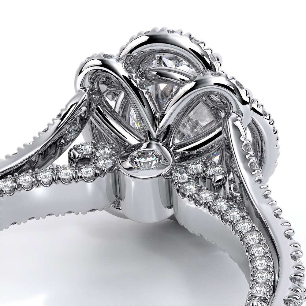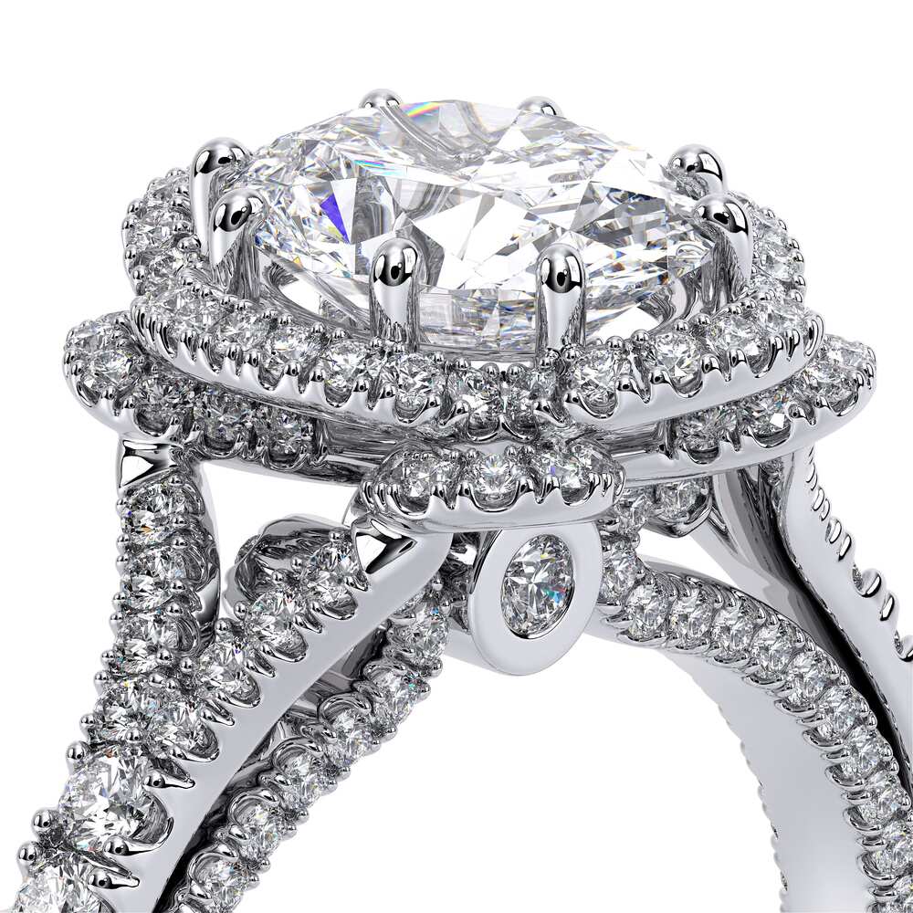 COUTURE-0444OV One of a Kind Double Floret Engagement ring that features a pave set cathedral diamond band, the subtle sparkle of our half diamond Riviera, adorned with the Verragio Crest and our Verragio Signature Beading, completed with the Couture shank.