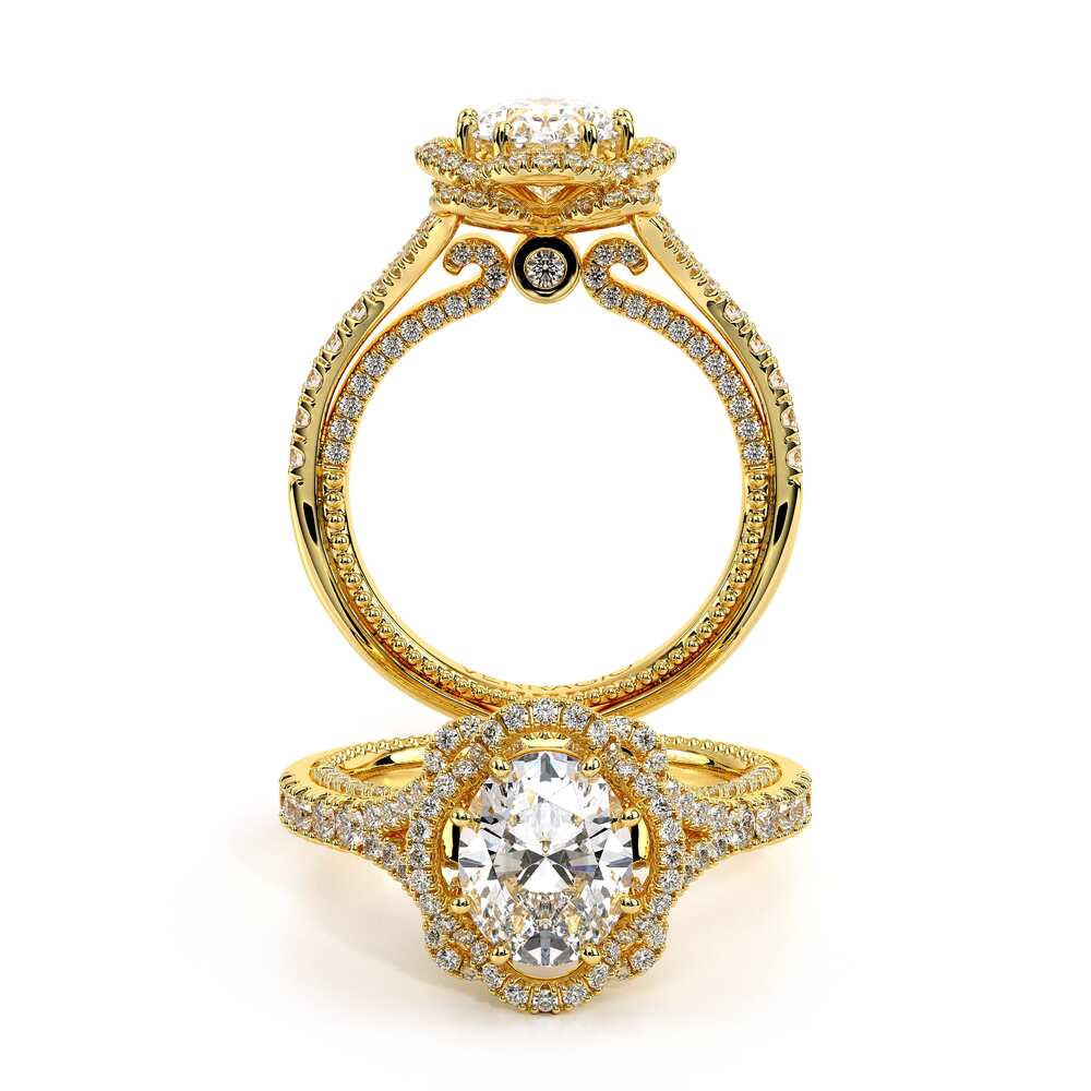 COUTURE-0444OV One of a Kind Double Floret Engagement ring that features a pave set cathedral diamond band, the subtle sparkle of our half diamond Riviera, adorned with the Verragio Crest and our Verragio Signature Beading, completed with the Couture shank.