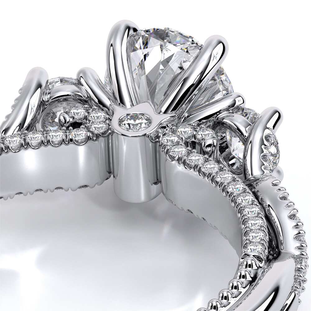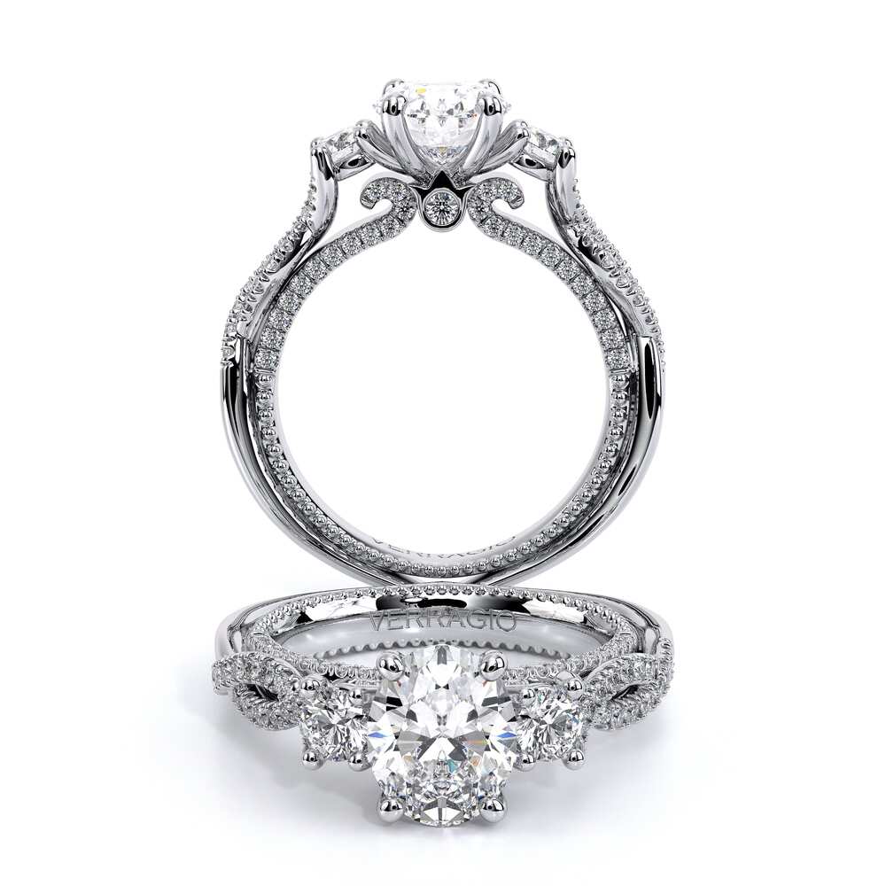 COUTURE-0450OV Timeless Twist Oval three stone Engagement ring that features a pave set cathedral diamond band, the subtle sparkle of our half diamond Riviera, adorned with the Verragio Crest and our Verragio Signature Beading, completed with the Couture shank.