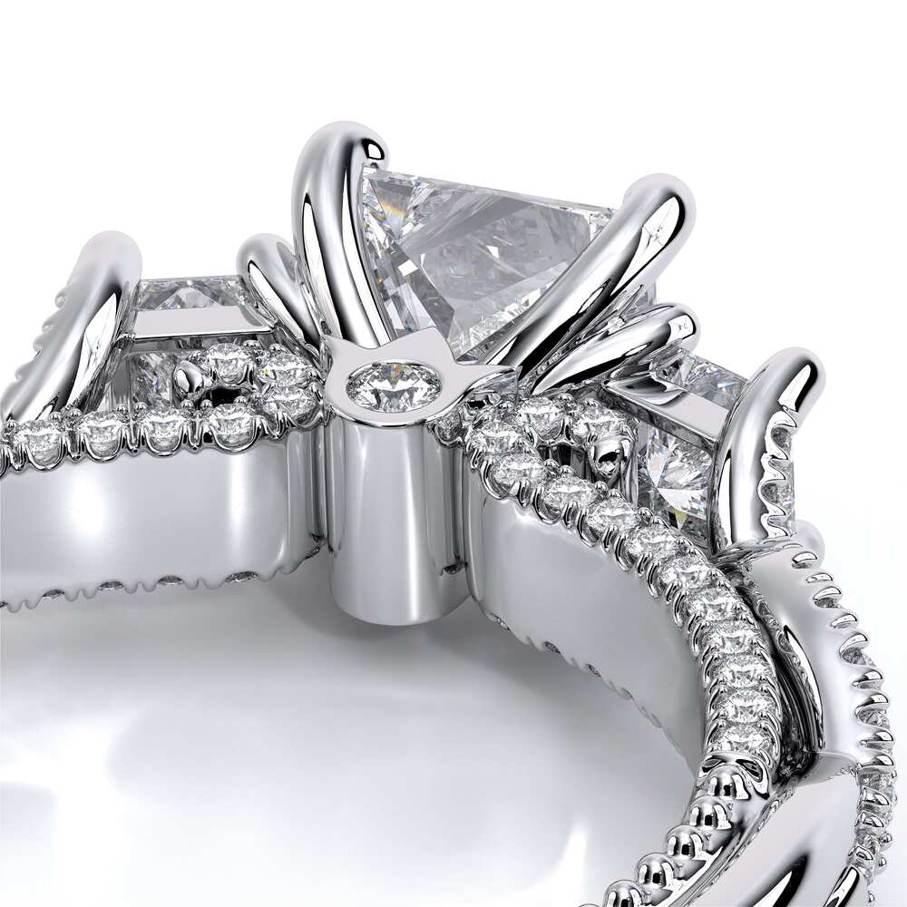 COUTURE-0450P Timeless Twist Princess three stone Engagement ring that features a pave set cathedral diamond band, the subtle sparkle of our half diamond Riviera, adorned with the Verragio Crest and our Verragio Signature Beading, completed with the Couture shank.