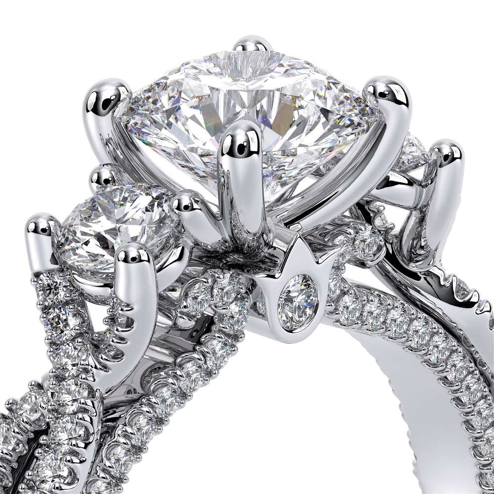 COUTURE-0450R Timeless Twist Round three stone Engagement ring that features a pave set cathedral diamond band, the subtle sparkle of our half diamond Riviera, adorned with the Verragio Crest and Signature Beading, completed with the Couture shank.
