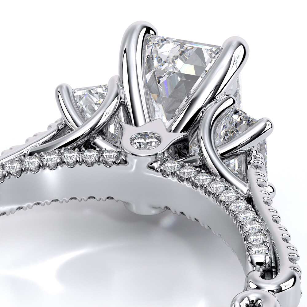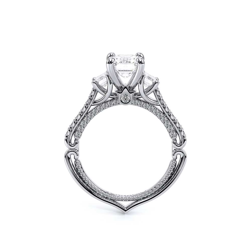 COUTURE-0470EM Beautiful Emerald three stone Engagement ring pave set with round brilliant diamonds, adorning the Verragio Crest and half Diamond Riviera along with our Verragio Signature Beading profile, completed with the Couture shank.