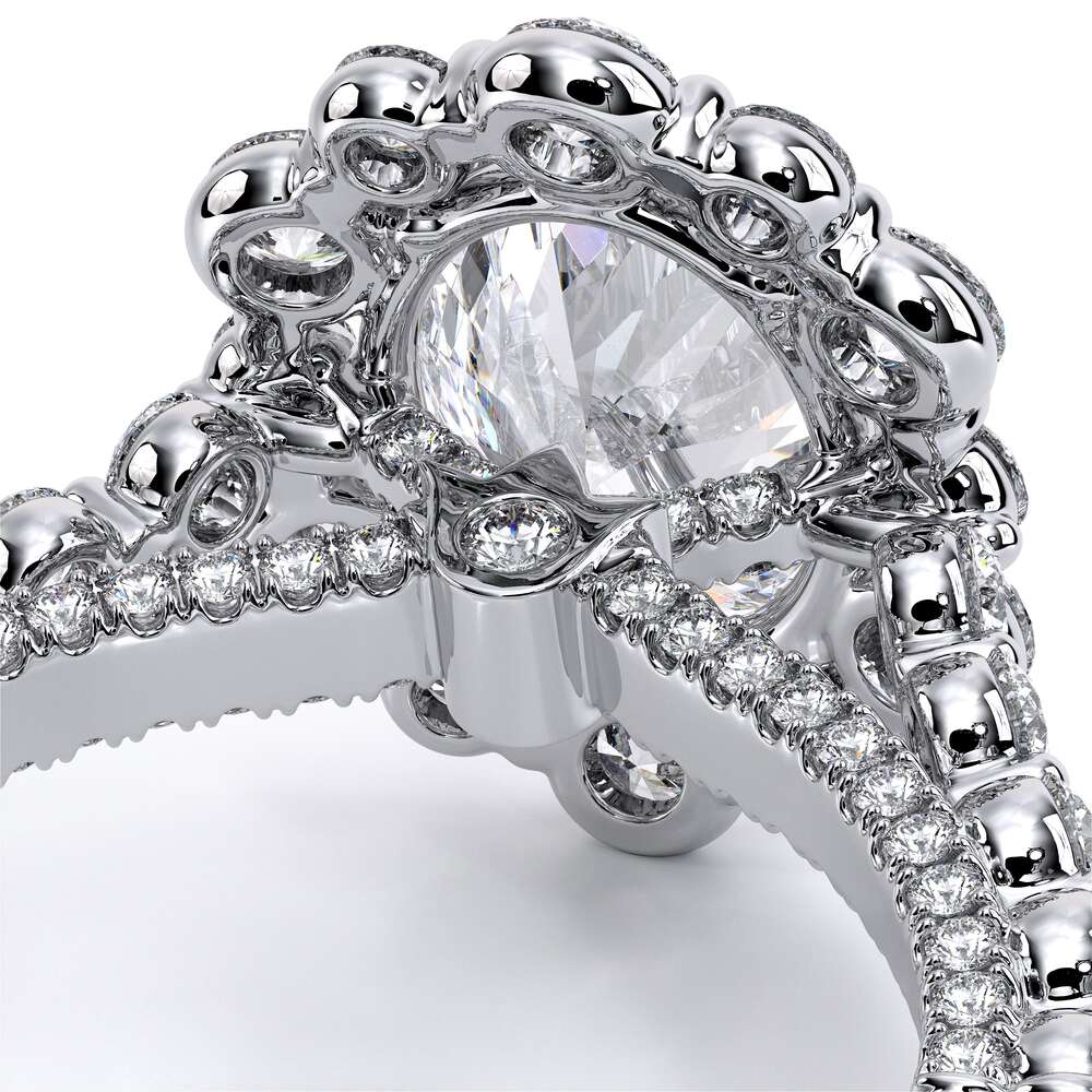 COUTURE-0480OV Features, bezel set brilliant-cut diamonds on our new Amore halo with meticulously set diamonds on a straight band. All details are elevated with the addition of our 1/2 Diamonds Riviera with Verragio's timeless signature crest and beading.