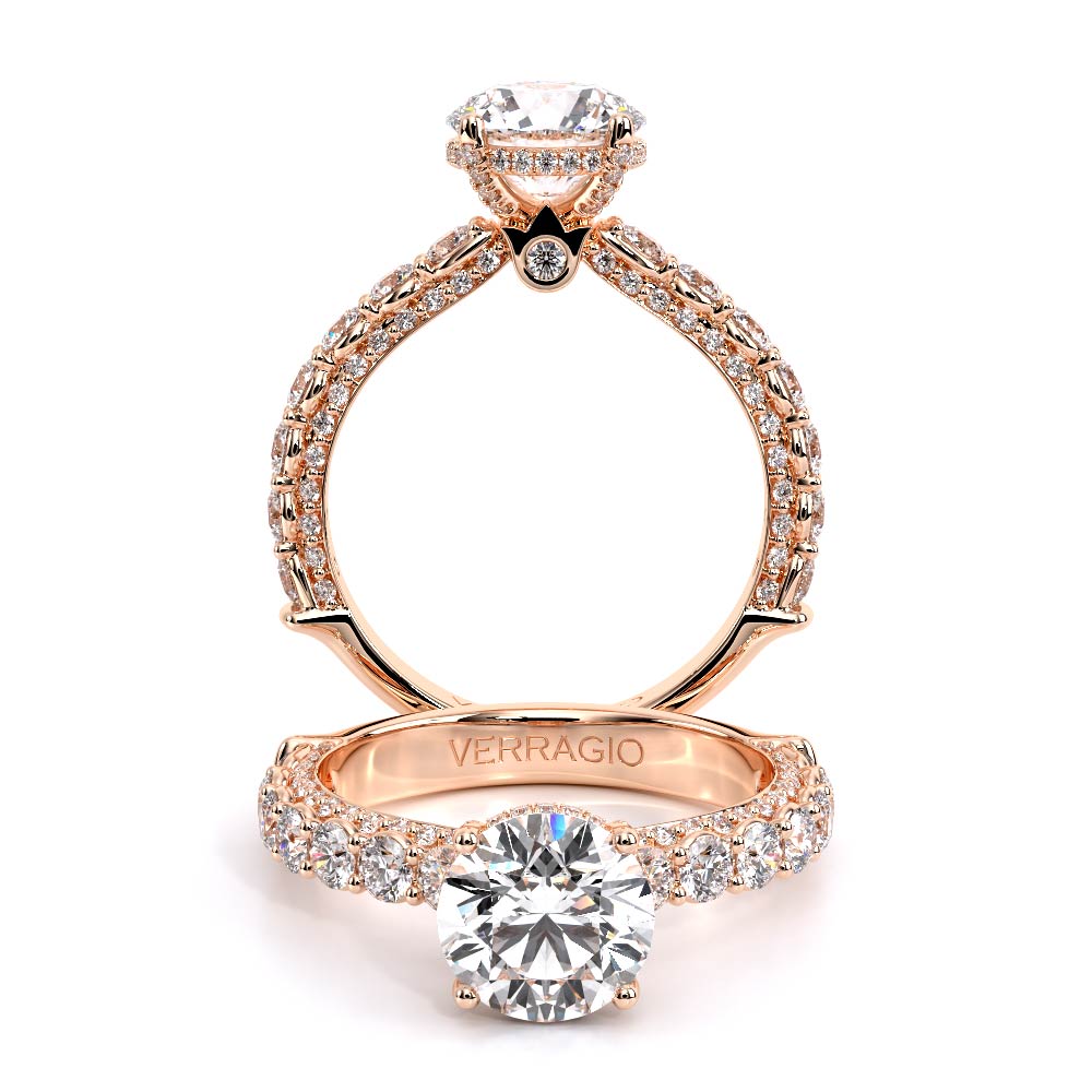 Couture-0489R-2.5 is an elevated four-prong engagement ring featuring a diamond-bridge head designed to highlight your center stone. Meticulously-set round diamonds in a shared-prong setting wrap the elegant shank, enhanced with a pave-set three-quarter diamond riviera. The Verragio signature crest completes the statement look.