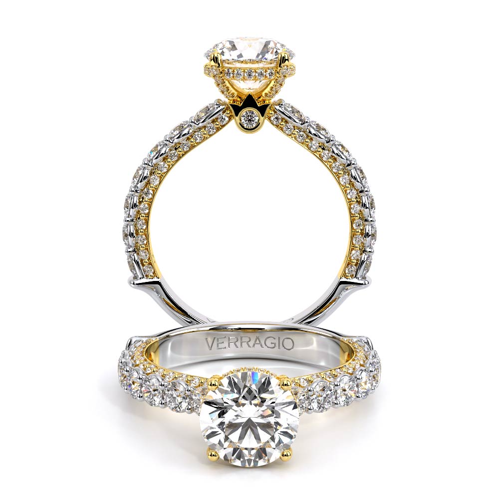 Couture-0489R-2.5 is an elevated four-prong engagement ring featuring a diamond-bridge head designed to highlight your center stone. Meticulously-set round diamonds in a shared-prong setting wrap the elegant shank, enhanced with a pave-set three-quarter diamond riviera. The Verragio signature crest completes the statement look.