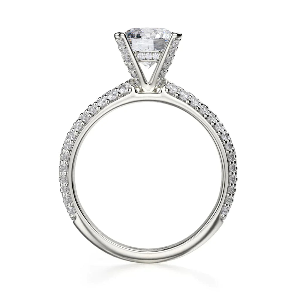 Immaculate Michael M engagement ring with stunning round center diamond setting. Adorned with over 0.75 carats of side diamonds in elegant pave setting. Crafted from high-quality 950 platinum for unrivaled purity and elegance.