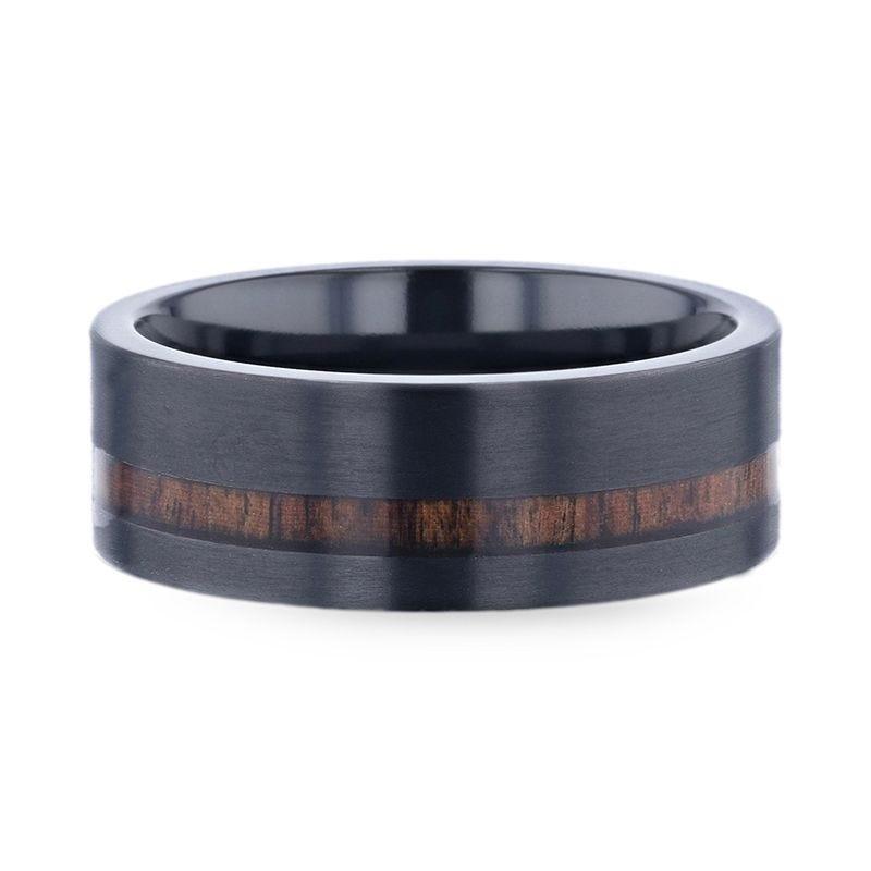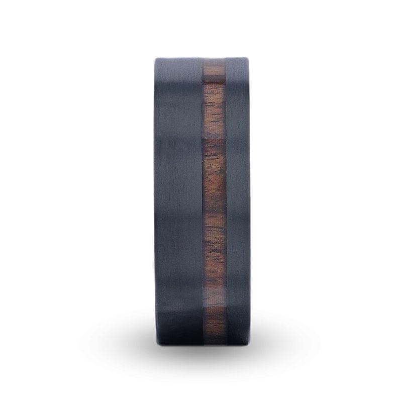 DARING Off-Set Koa Wood Inlaid Black Titanium Men's Wedding Band With Flat Brushed Finish - 8mm
